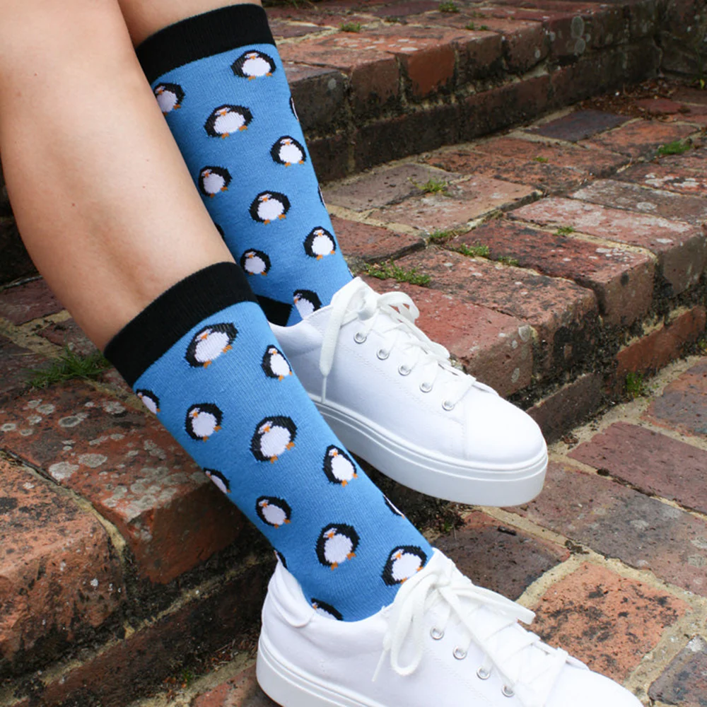 Schattige bamboe sokken van het merk Swole Panda. Deze sokken zijn hemelsblauw met een motiefje van zwart-witte pinguïns. Ook de tip, hiel en boord zijn zwart.