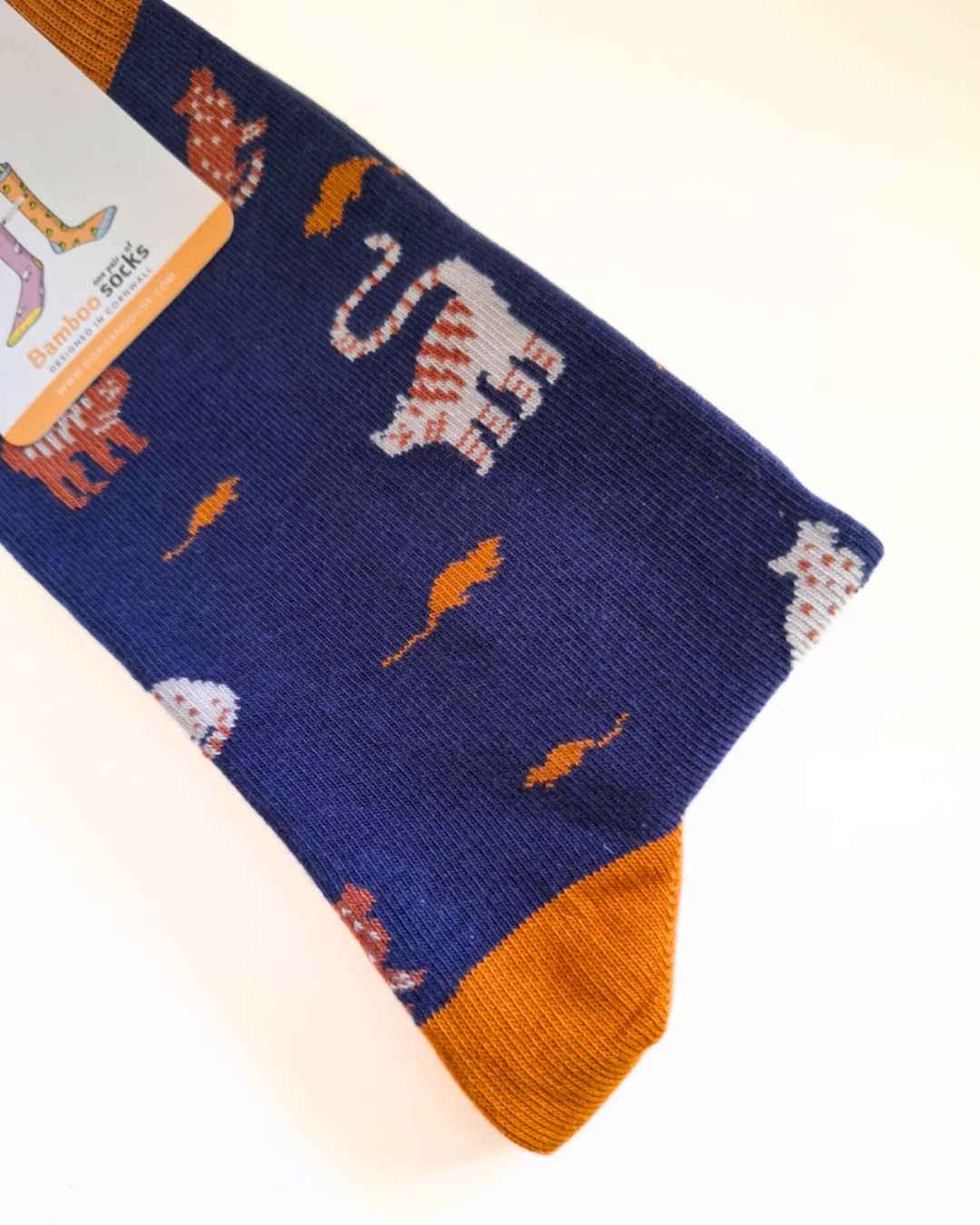 Donkerblauwe sokken met een motief van katten en muizen. De katten zijn bruin met wit, de muizen warm oranje. De hiel, tip en de brede boord hebben dezelfde kleur. Zijn bamboe sokken bij jou ook favoriet? Dan zit je goed bij Meer dan Mooi: wij hebben het grootste aanbod van Nederland en België!