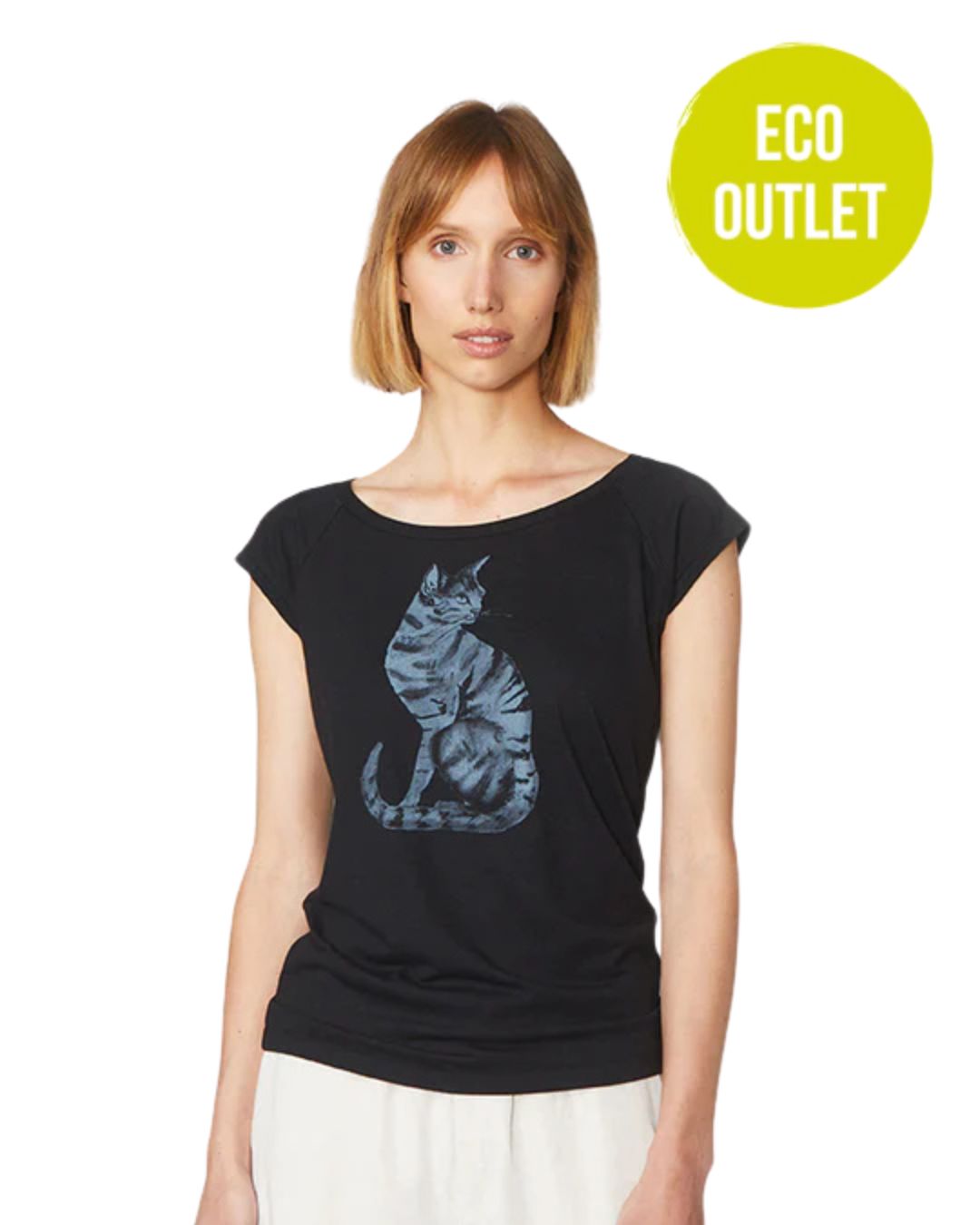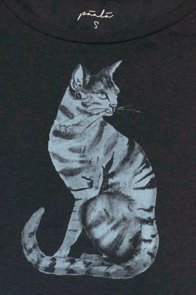 Damesshirt van Paala in een mix van bamboe en biologisch katoen. Dit model heeft een vrouwelijke halslijn en een raglanmouwtje en is licht getailleerd. Dit shirt is zwart, met op de voorkant de print van een grijze poes.