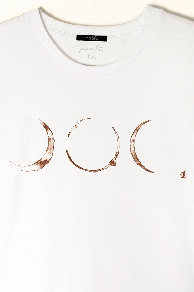 Zijn dit nu koffiekringen? Inderdaad! Drie afdrukken van een kopje koffie vormen samen drie manen. Het shirt zelf bestaat uit een mooie kwaliteit 100% biologisch katoen. De kleur is wit, de print bruin.