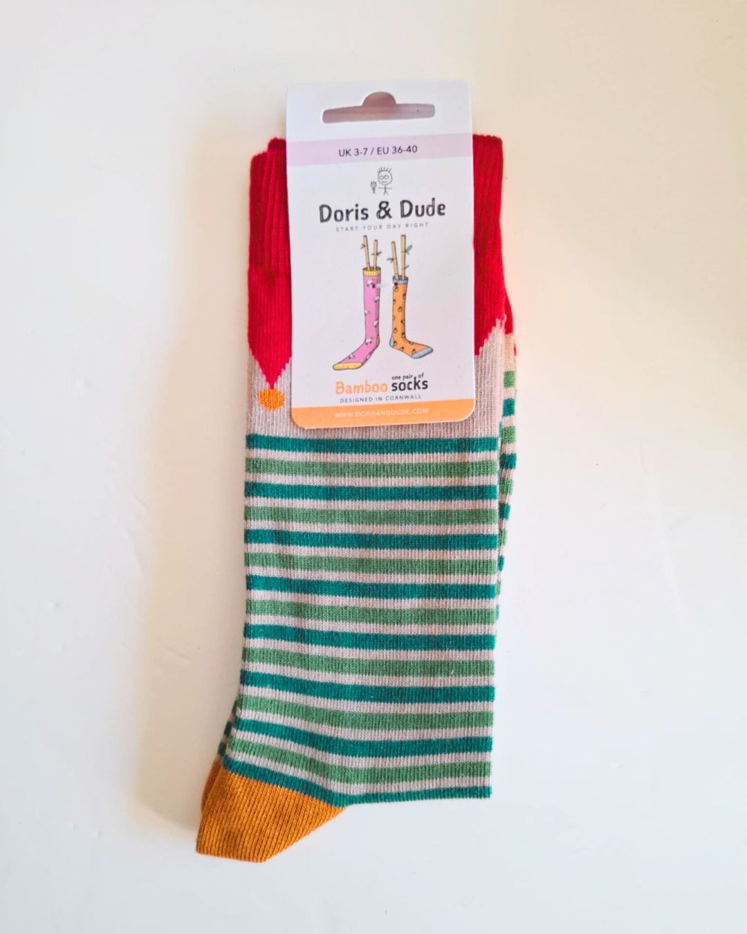 Deze streepjessokken hebben een leuke verrassing! Boven de strepen is er een vrolijk baldakijn. De streepjes zijn grasgroen, donkergroen en zand, het baldakijn is rood. Bamboe sokken van Doris and Dude zijn heel aangenaam om te dragen en zacht en sterk tegelijk: een waar plezier om te dragen!
