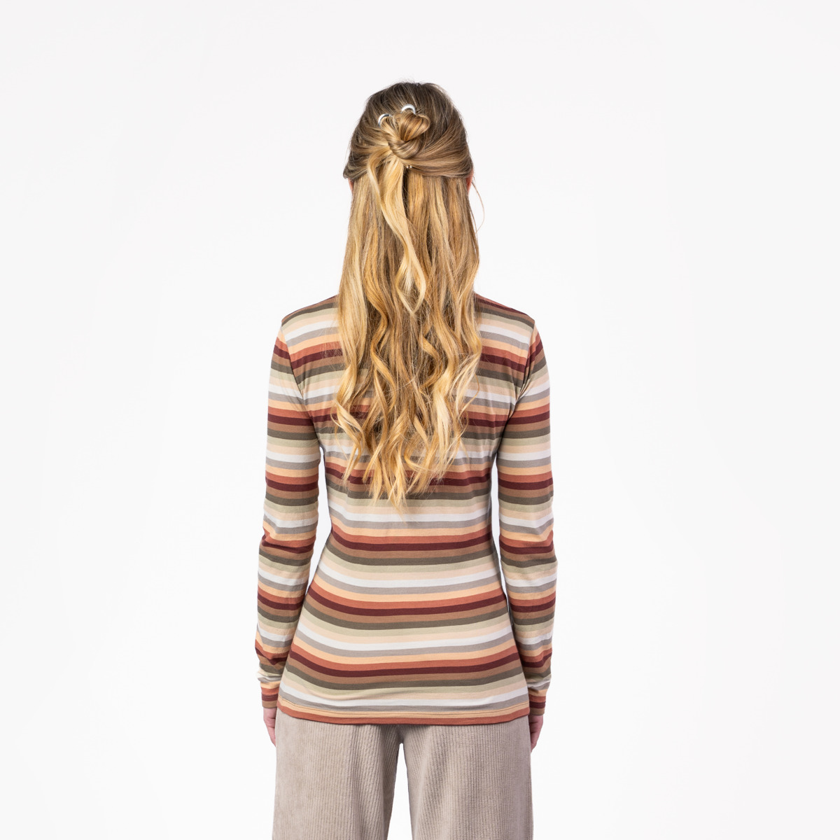 Damesshirt bio katoen rolkraag, zonder elasthane strepen herfsttinten – LIVING CRAFTS